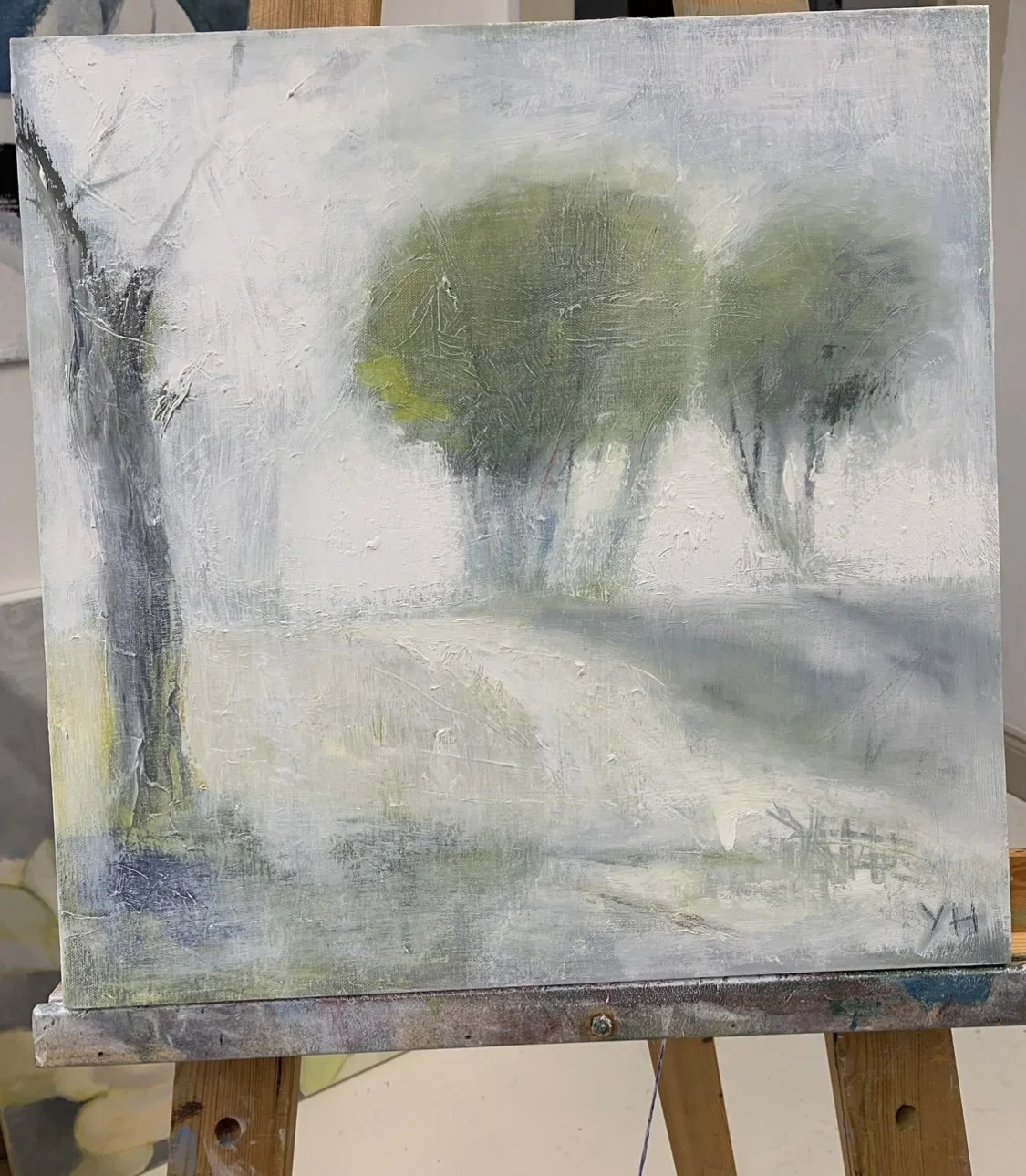 “ Disig Morgon SYMBOLISERAR EN MELANKOLISK OCH DRÖMLIK VÄRLD, DÄR ENSAMMA TRÄD STÅR SOM TYSTA VÄKTARE I EN ÖDE LANDSKAP TÄCKT AV VINTERNS KYLA. DEN ÖVERGRIPANDE FÄRGPALETTEN DOMINERAS AV OLIKA NYANSER AV VITT, GRÅTT OCH SVAGT BLÅTT, VILKET FÖRSTÄRKER DEN DYSTRA ATMOSFÄREN. “