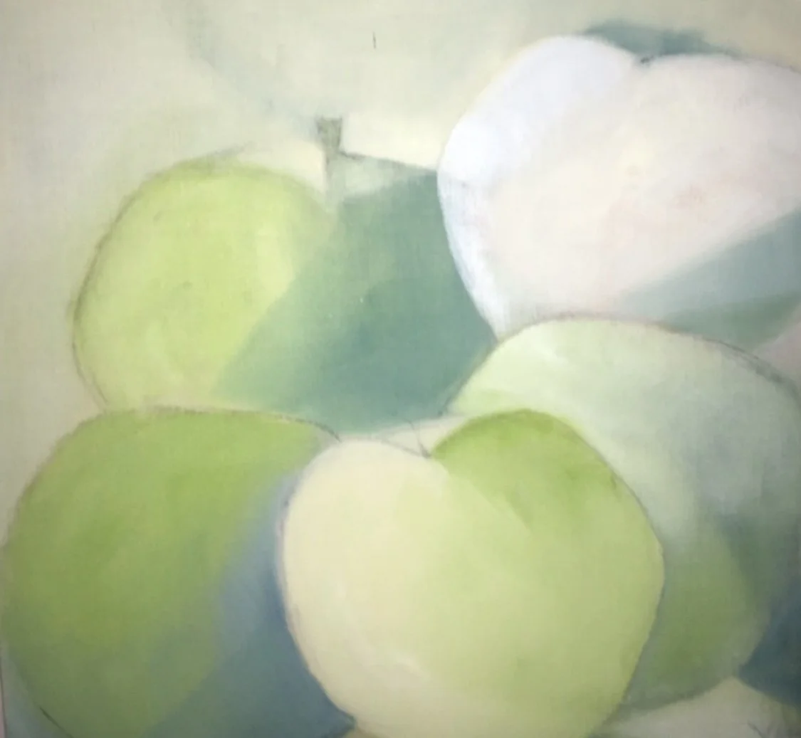 “ Stilleben (2) framställer fem äpplen i olika gröna nyanser, där varje äpple har sin unika färgpalett, från djupare mörkgrönt till ljusare toner. Ett av äpplena är nästan helt vitt, översköljt av ett starkt ljus från ovan, vilket skapar en stark kontrast mot de övriga. De subtila mönstren i gröna nyanser på varje äpple ger en känsla av rörelse och liv, som om de är fångade i ett spel mellan ljus och skugga. “